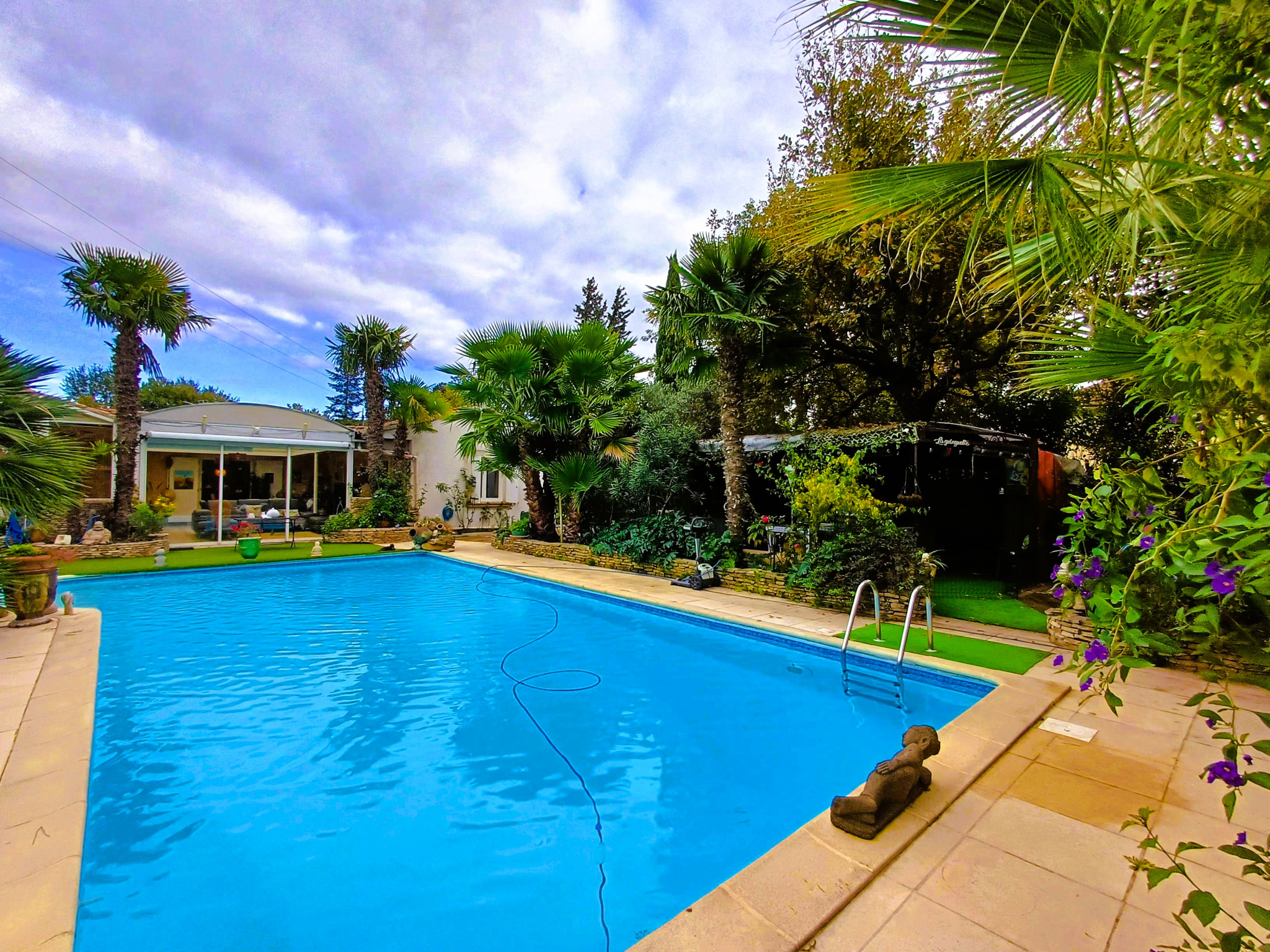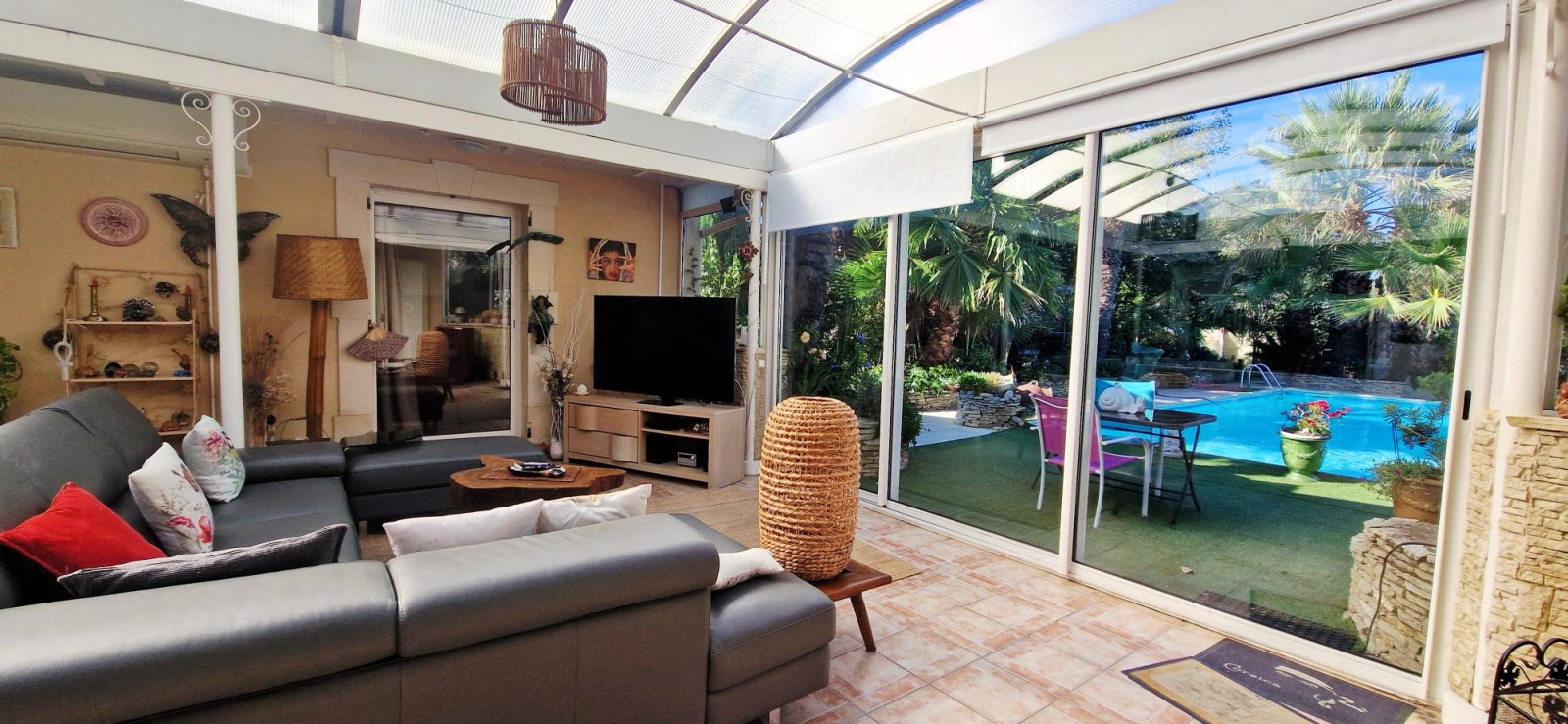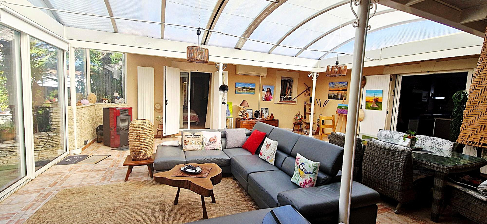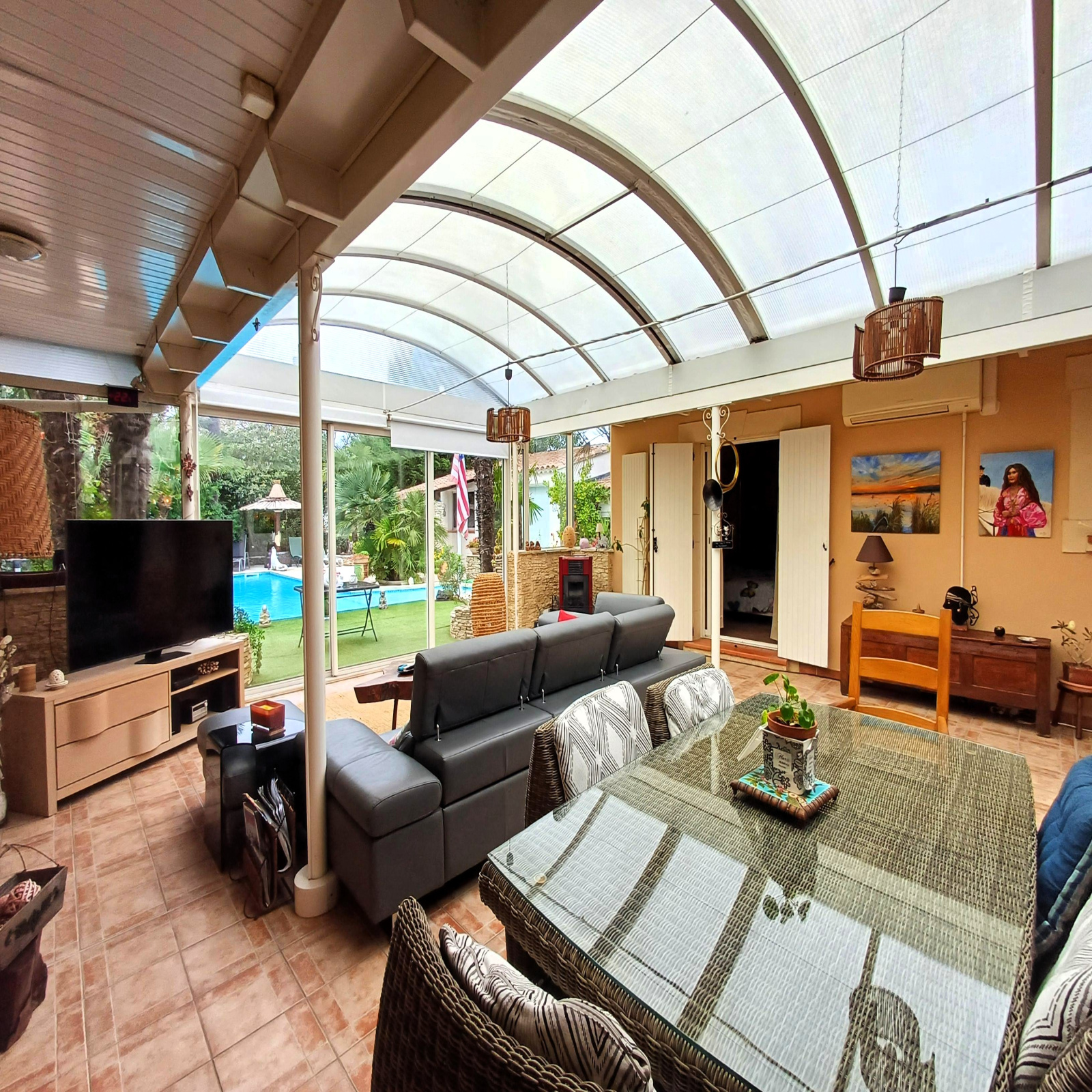 - Véranda thermolaquée de 58 m² (chauffée et climatisée) avec poêle à granulés, véritable pièce à vivre donnant sur la piscine,