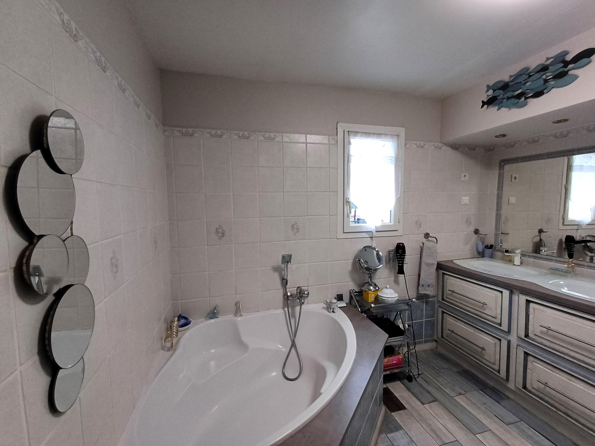- Salle de bains refaite en 2024 avec douche italienne, baignoire d’angle et double vasque,
