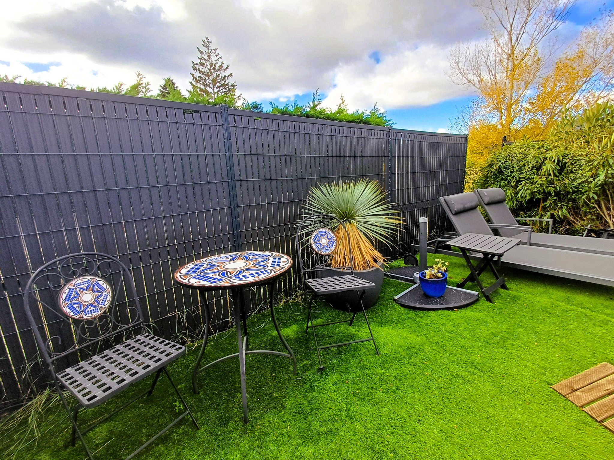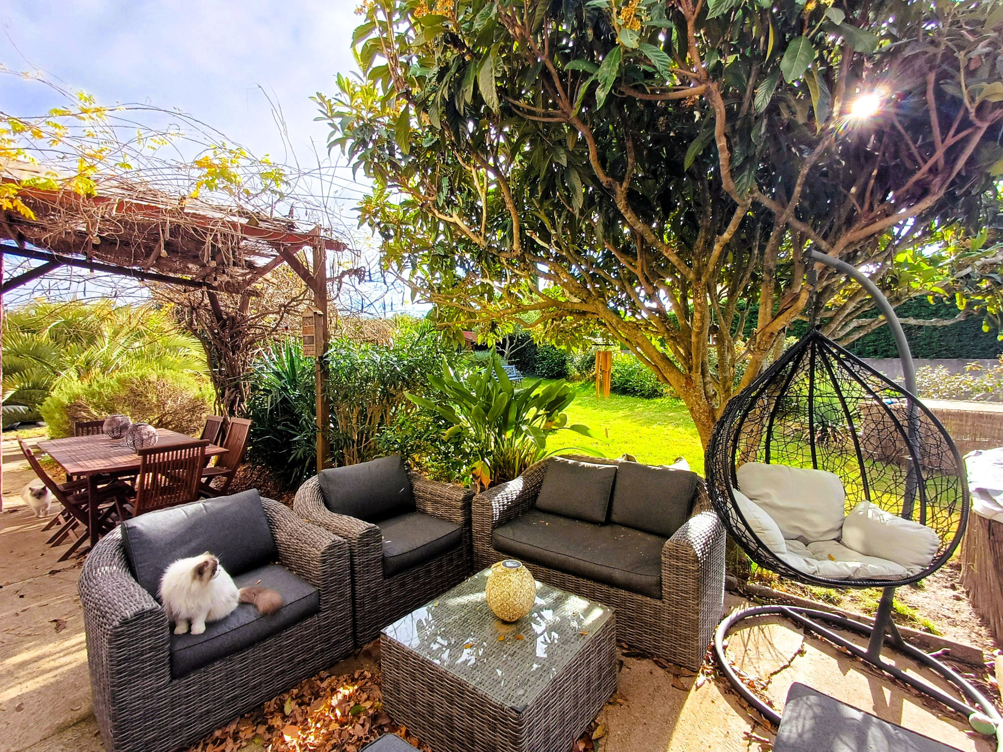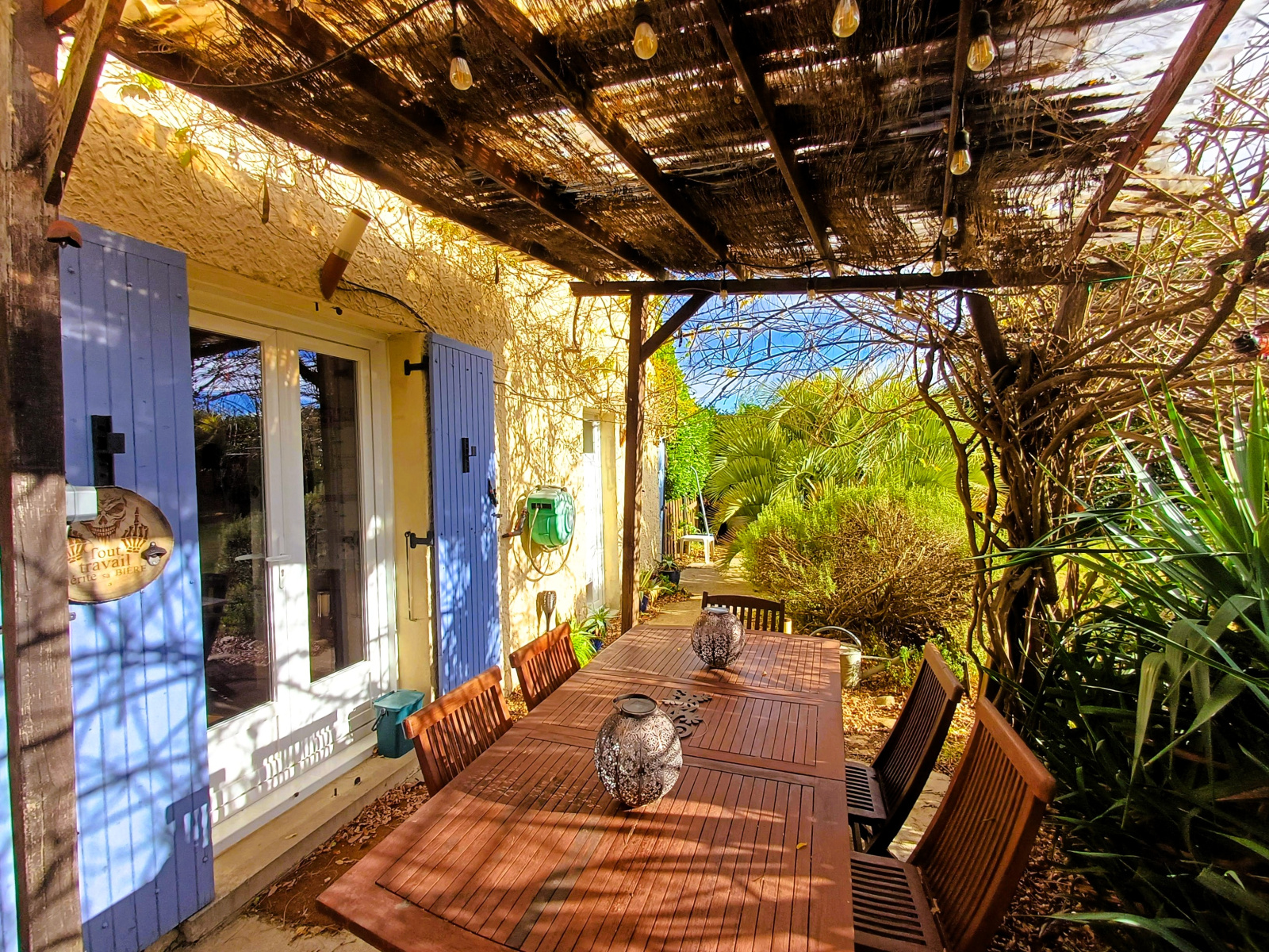 d’une terrasse ombragée idéale pour salon de jardin et table à manger,