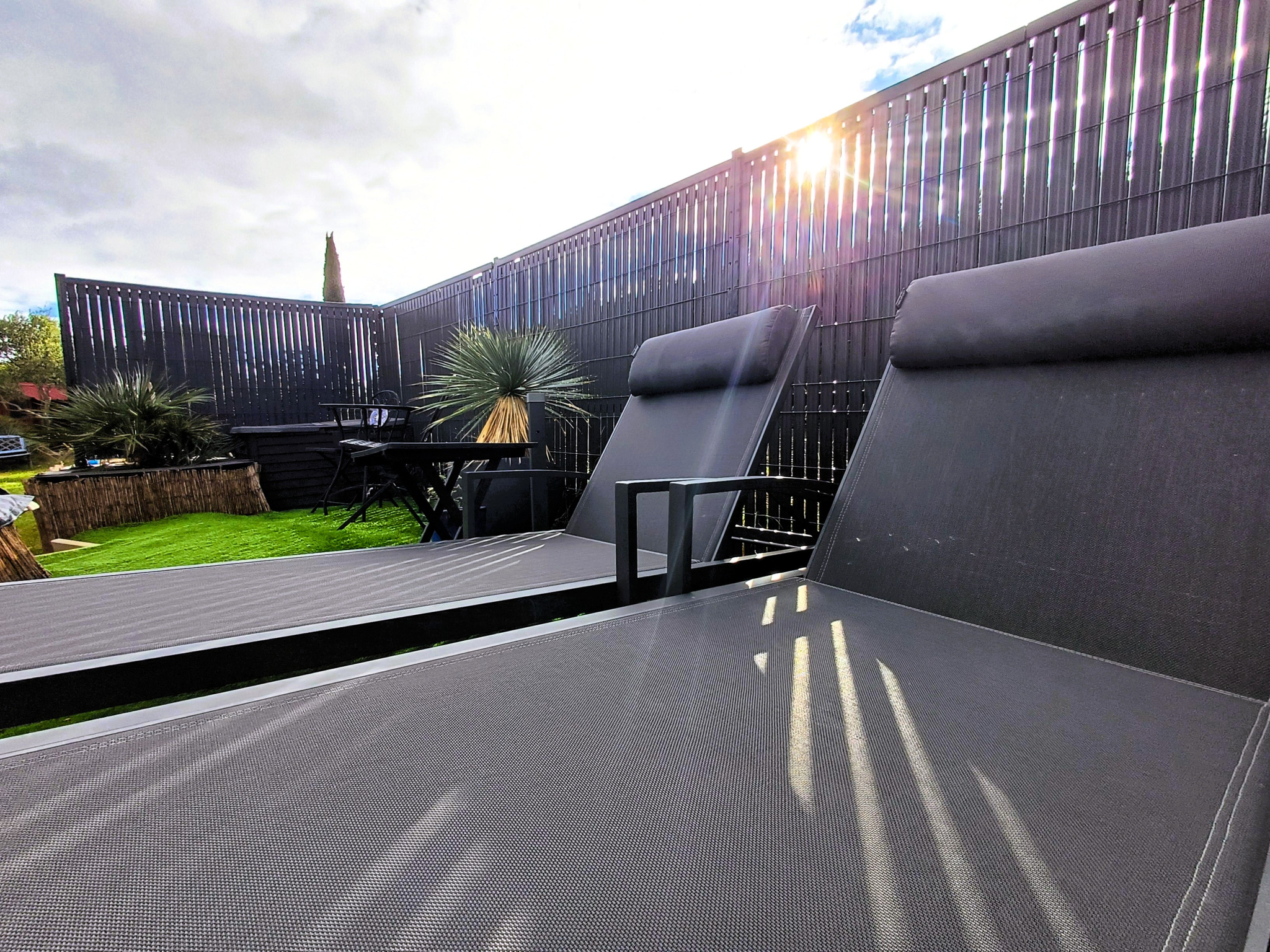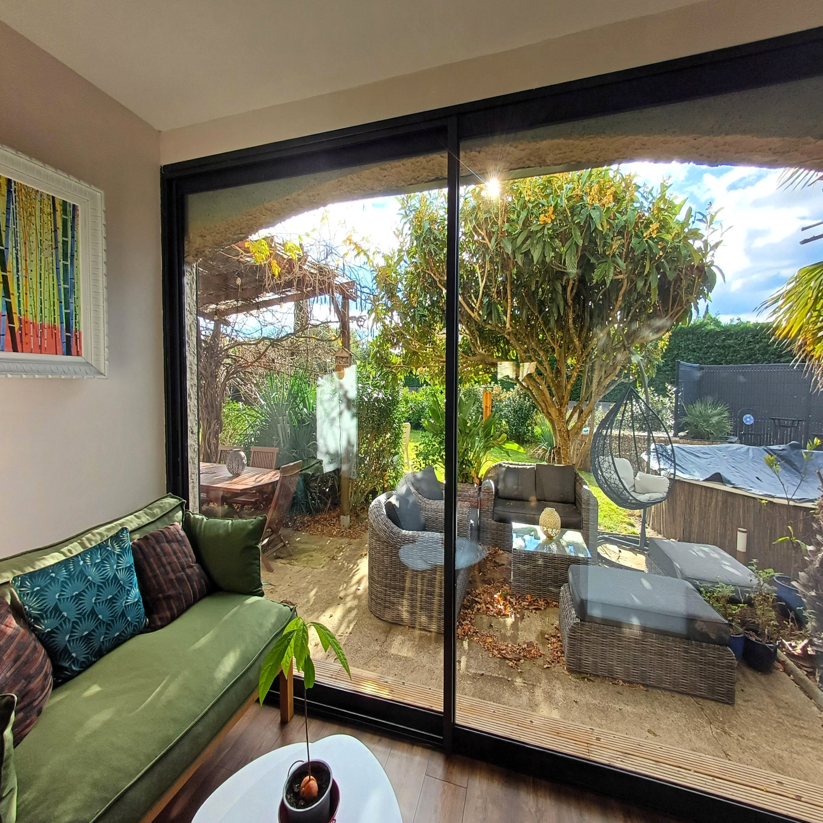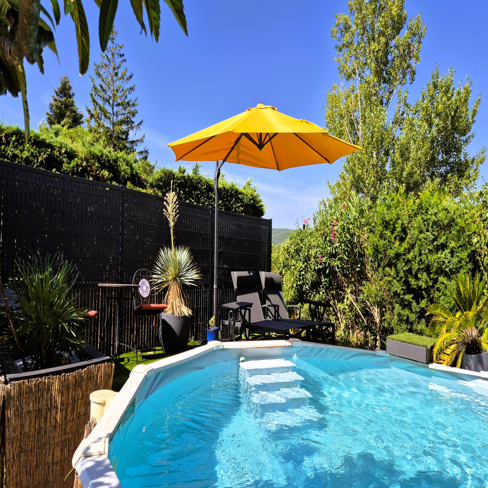 d’une terrasse ombragée idéale pour salon de jardin et table à manger,