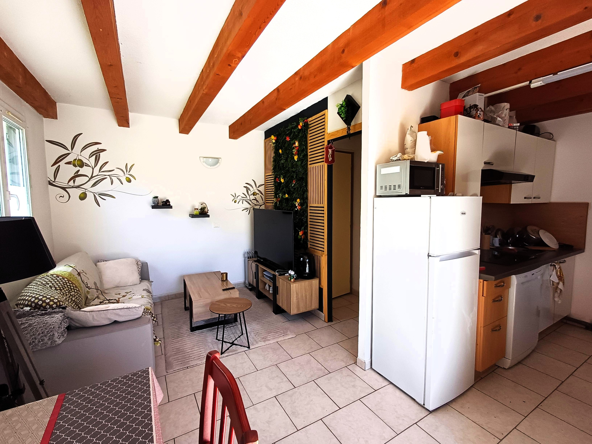 Ce logement de type T3 se compose d’une agréable pièce de vie d’environ 21 m² avec cuisine américaine semi-équipée ouverte sur le séjour, idéale pour profiter d’un espace convivial.